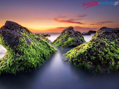 Puzzle Zachód Słońca, Morze, Skały, Mech