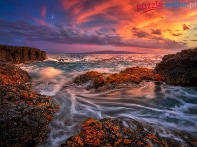Zachód słońca, Niebo, Morze, Skały, Czerwone