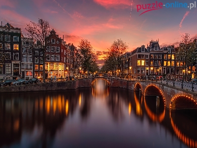 Most, Amsterdam, Holandia, Rzeka, Drzewa, Światła, Zachód słońca, Kanał Leidsegracht, Domy