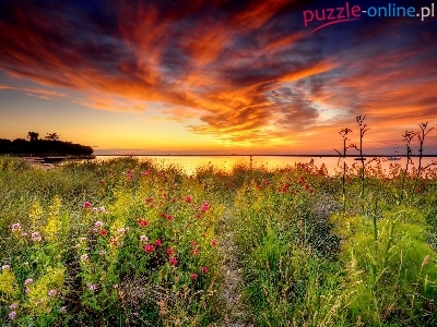 Łódki, Słońca, Złoty, Łąka, Trawa, Jezioro, Kwiaty, Zachód