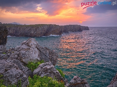 Puzzle Skały, Zachód słońca, Morze, Rośliny