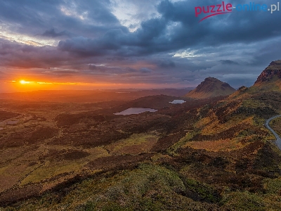 Góry, Wyspa Skye, Szkocja, Quiraing, Ścieżka, Zachód słońca, Chmury, Wzgórza, Jeziora