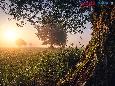 Puzzle Łąka, Zachód słońca, Drzewa, Trawa