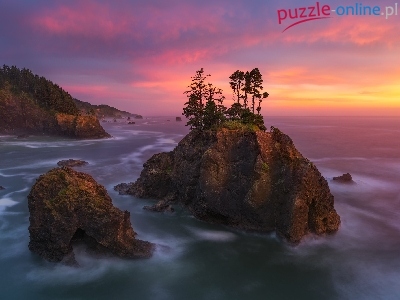 Stan Oregon, Morze, Drzewa, Zachód słońca, Stany Zjednoczone, Park stanowy Samuela H. Boardmana, Skały