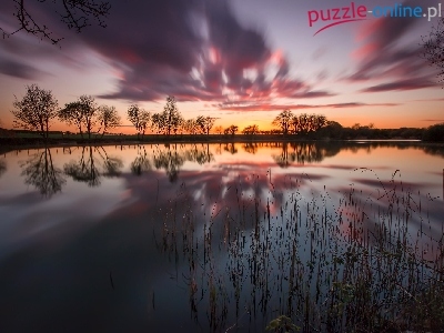 Zachód, Drzewa, Odbicie, Jezioro, Trawa, Słońca