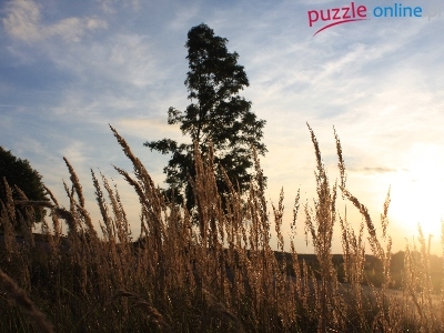 Puzzle Zachód, Drzewo, Trawy, Słońca