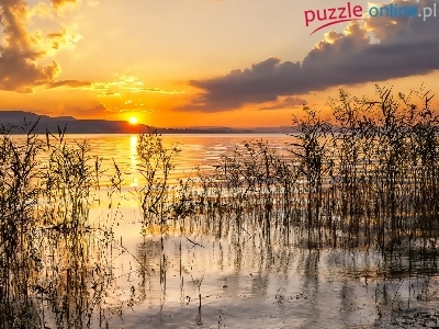 Puzzle Zachód Słońca, Jezioro, Trawy, Chmury