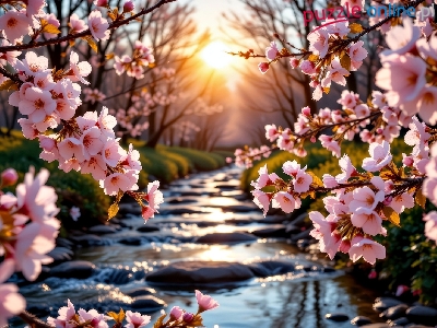 Zachód słońca, Grafika AI, Strumień, Kwitnące, Gałęzie, Kwiaty, Wiosna, Różowe
