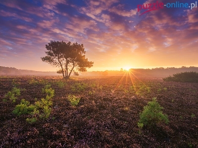 Wrzosowisko, Zachód słońca, Drzewa, Holandia, Łąka, Wrzosy