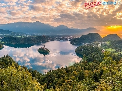 Wyspa Blejski Otok, Drzewa, Zachód słońca, Góry Alpy Julijskie, Las, Słowenia, Jezioro Bled, Chmury