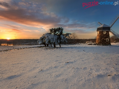 Puzzle Zachód słońca, Zima, Wiatrak