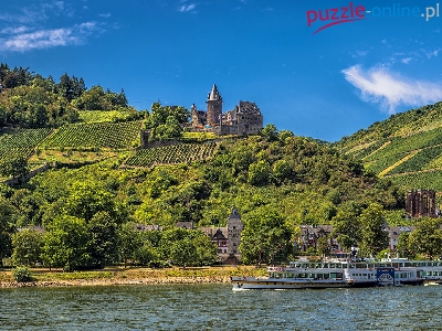 Zamek, Niemcy, Pola, Statek pasażerski, Wzgórze, Bacharach, Rzeka Ren