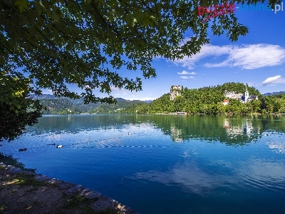 Jezioro Bled, Zamek Bled Castle, Drzewa, Kościół, Góry, Słowenia, Kaczki, Wzgórze