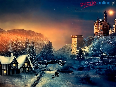 Zamek, Fantasy, Zima, Noc, Domy
