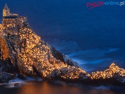 Puzzle Zamek, Morze, Skała, Światła