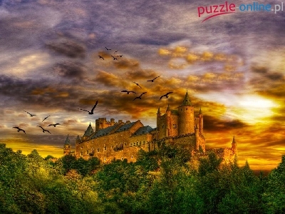 Zamek, Drzewa, Zachód, Słońca, Ptaki