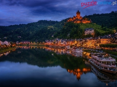 Statki, Zamek w Cochem, Zmrok, Rzeka, Niemcy, Światła