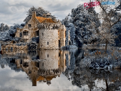 Dworek, Staw, Zieleń, Chmury, Anglia Dworek, Staw, Drzewa, Scotney Castle, Hrabstwo Kent