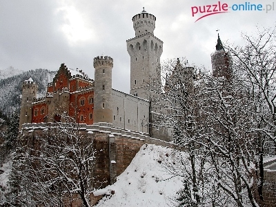 Skały, Bawaria, Zima, Niemcy, Zamek Neuschwanstein, Drzewa