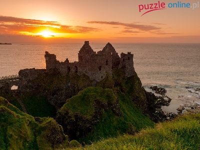 Irlandia Północna, Ruiny, Morze, Wybrzeże, Zamek Dunluce Castle, Hrabstwo Antrim, Zachód słońca