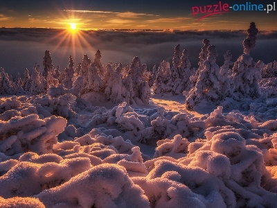 Zasypane, Drzewa, Zachód słońca, Zima, Śniegiem