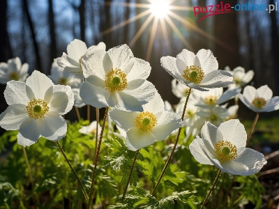 Promienie słońca, Białe, Zawilce, Kwiaty, Grafika, Las