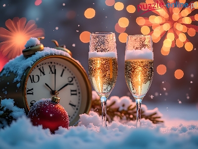 Nowy Rok, Kieliszki, Zegar, Bombka, Grafika, Åšnieg