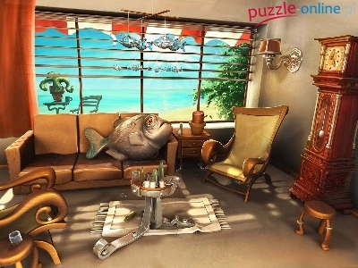 Zegar, Kanapa, Okno, Pokój, Ryby, Stolik