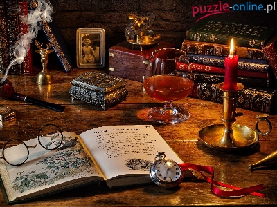 Fajka, Kompozycja, Kieliszek, Zegarek, Świeca, Książki, Okulary