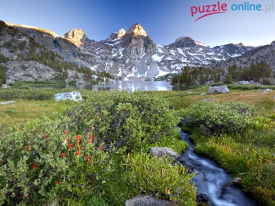 Puzzle Zieleń, Góry, Jezioro, Kwiaty