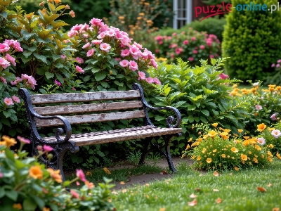 Puzzle Kwiaty, Ogród, Ławka, Zieleń