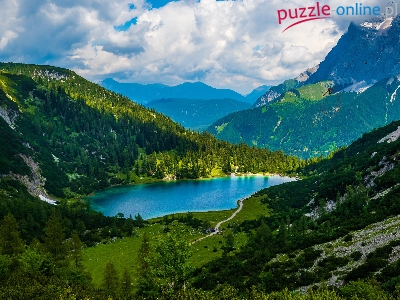 Zieleń, Góry, Tyrol, Austria, Drzewa, Alpy, Jezioro, Chmury, Lasy, Seebensee