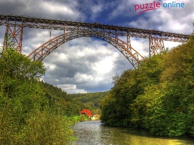 Puzzle Zieleń, Rzeka, Most, Chmury
