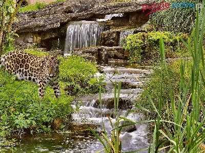 Zieleń, Wodospad, Skały, Lampart