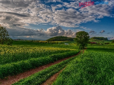 Puzzle Zielone, Chmury, Droga, Pola