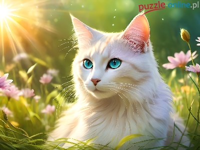 Kwiaty, Kot, Biały, Zielone, Grafika, Oczy
