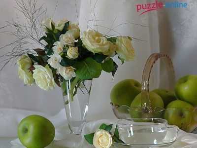 Puzzle Zielone, Białe, Róże, Jabłka