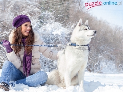 Puzzle Zima, Siberian Husky, Brunetka, Åšnieg
