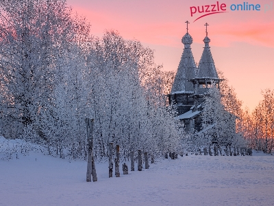 Drzewa, Rosja, Cerkiew, Śnieg, Wieś Chelmuzhi, Karelia, Zima