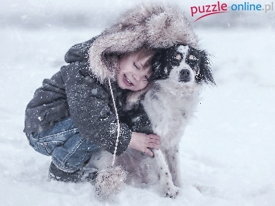 Zima, Radość, Pies, Chłopczyk, Śnieg