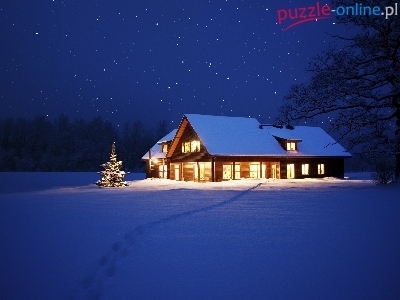 Puzzle Zima, Oświetlony, Dom, Choinka
