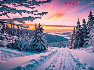Zachód słońca, Droga, Zima, Las, Grafika, Drzewa