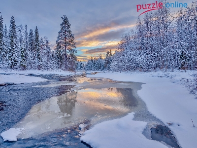 Zima, Obwód murmański, Rosja, Półwysep Kolski, Drzewa, Rzeka Piła