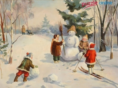 Puzzle Zima, Bałwan, Dzieci, Malarstwo