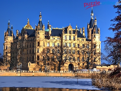 Zima, Schwerin, Niemcy, Zamek, Jezioro, Świt
