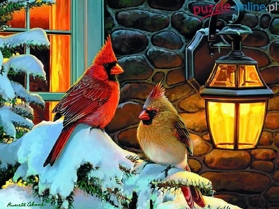 Zima, Choinki, Ptaki, Kardynały, Ośnieżone