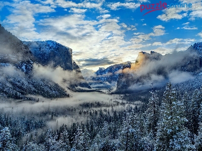 Góry, Park Narodowy Yosemite, Mgła, Kalifornia, Dolina Yosemite Valley, Zima