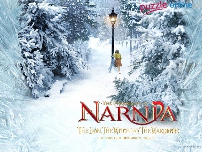 choinki, latarnia, napis, The Chronicles Of Narnia, dziewczynka, zima