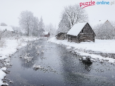 Puzzle Rzeka, Domy, Drzewa, Zima
