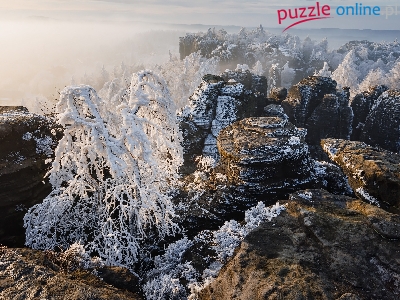 Zima, Elbe Sandstone Mountains, Góry Połabskie, Skały, Czechy, Drzewa